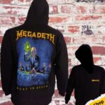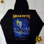 MEGADETH Polera Rust in Peace. Megadeth es una de las bandas más legendarias e influyentes del thrash metal, un género que se caracteriza por su velocidad, agresividad y complejidad técnica. La banda fue fundada en 1983 por Dave Mustaine, quien había sido expulsado de Metallica, otra de las grandes bandas del thrash metal. Mustaine se propuso crear una banda que superara a Metallica en todos los aspectos, y reclutó al bajista David Ellefson, con quien formó el núcleo de Megadeth.